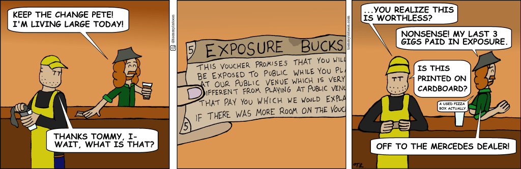 Things I would play gigs for before “exposure”, in no particular order: Money, food, beer, vibes, hugs. I don’t need to be “exposed”, thanks.